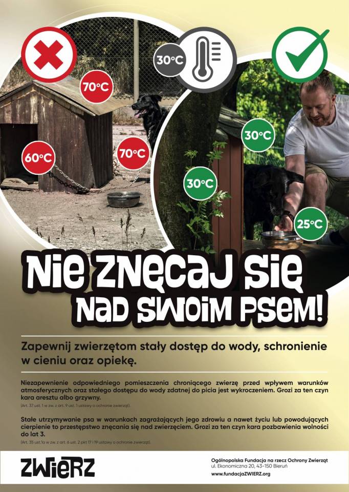 Wysokie temperatury są zagrożeniem nie tylko dla zdrowia ludzi, ale także dla zwierząt.Odwodnienie, poparzenia, udar to tylko niektóre z zagrożeń, które wynikają z niewłaściwej opieki nad zwierzęciem latem. Szczególnie w trudnych warunkach są zwierzęta żyjące na uwięzi, pozostawione same sobie, często bez kropli wody zdatnej do picia. Buda, która stoi na otwartym słońcu i jest pokryta blachą nagrzewa się i temperatura w środku sięga nawet 70*C.  Metalowy łańcuch rozgrzewa się do podobnych temperatur i może powodować poparzenia
